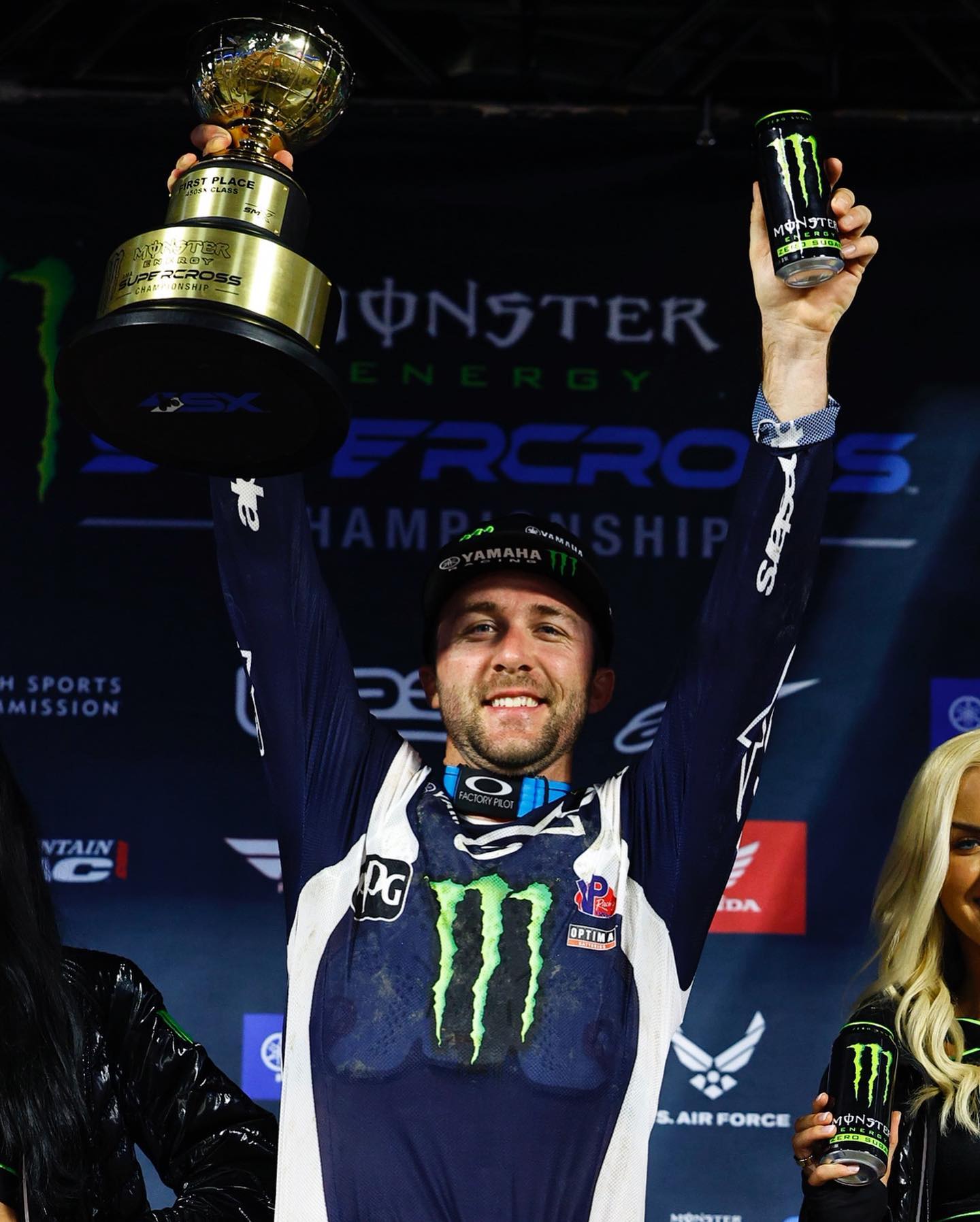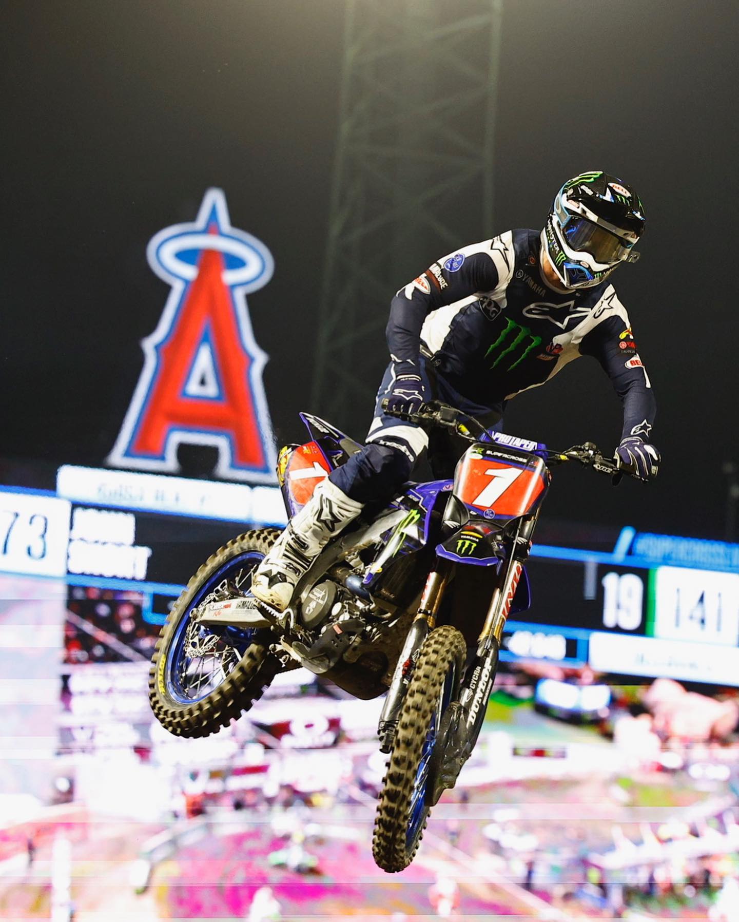 "Geweldige avond bij Anaheim 1! Onze nieuwe motor en setup waren de hele dag op punt. De baan was heel de dag verraderlijk vanwege de zachte overgangen met sporen en droge sprongen. Het kostte slechts 10 jaar proberen in de 450's eindelijk een A1 W te winnen !" - Eli Tomac